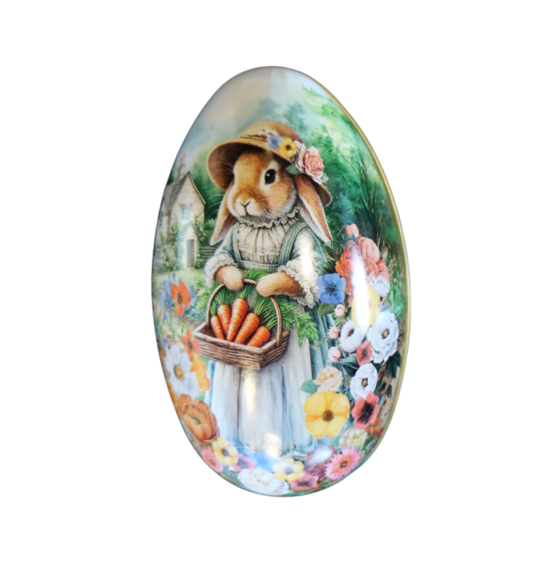 Lata decorativa em formato de ovo. Pode ser adquirida sozinha ou com ovinhos de chocolate.
