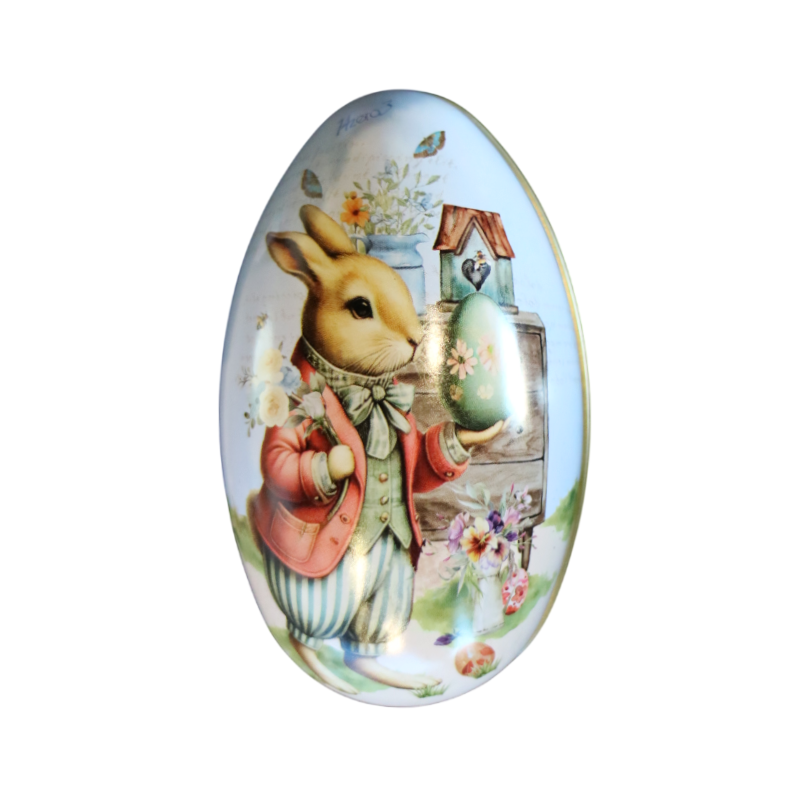 Lata decorativa em formato de ovo. Pode ser adquirida sozinha ou com ovinhos de chocolate.